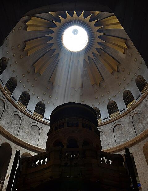 Sie ist der Dreh- und Angelpunkt der Weltgeschichte, ohne die, wie uns der heilige Paulus mahnt, „unsere Verkündigung leer (ist), leer auch euer Glaube.“ (1 Kor 15, 14). Doch trotzdem verraten uns die Evangelien recht wenig über den Ort der Auferstehung, dem leeren Grab, durch das die Fülle der Hoffnung offenbart wurde. „An dem Ort, wo er gekreuzigt worden war, befand sich ein Garten, und in dem Garten ein neues Grab, in dem noch niemand bestattet worden war“, weiß der Evangelist Johannes (Joh 19, 41). Es lag also in unmittelbarer Nähe des Hügels Golgota außerhalb der Stadtmauern Jerusalems, wie der Hebräerbrief (13,12) andeutet: „Darum hat auch Jesus … außerhalb des Tores gelitten.“