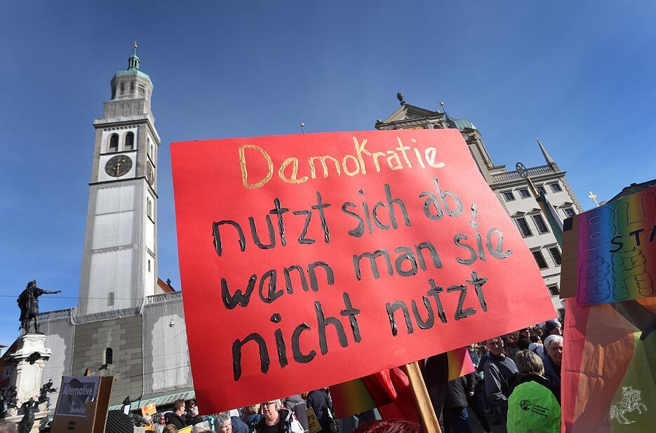 Nach Angaben der Polizei haben sich wider Erwarten über 25.000 Personen auf dem Augsburger Rathausplatz versammelt, um gegen Rechtsextremismus zu demonstrieren. Auf der Kundgebung sprachen unter anderem auch die aus Augsburg kommende Kulturstaatsministerin Claudia Roth (Grüne) und Augsburgs Oberbürgermeisterin Eva Weber (CSU).