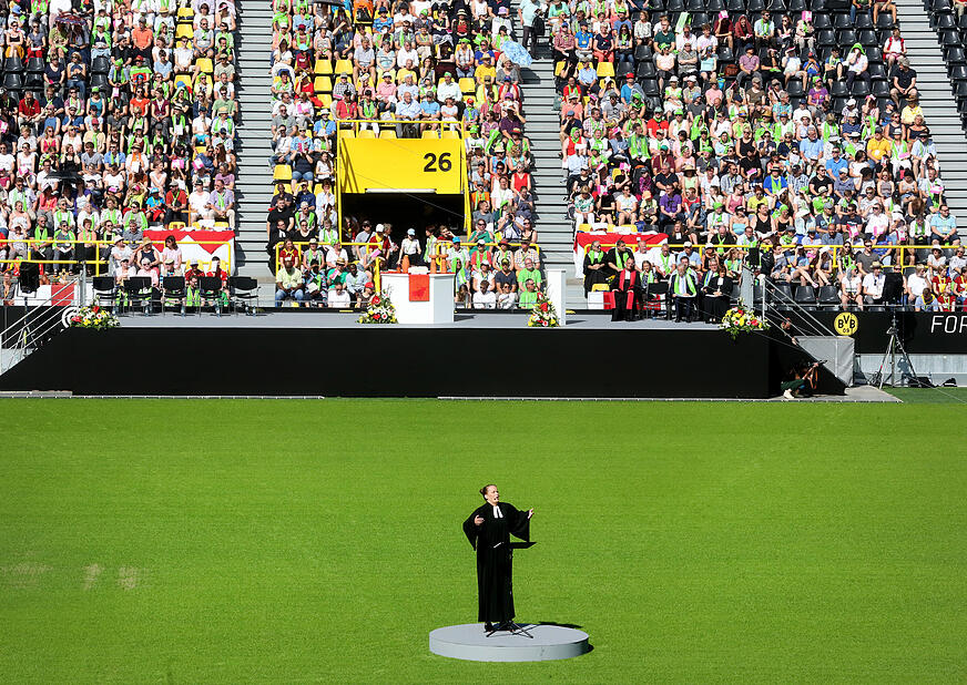 Wie notwendig eine solche „lange Reise in die Tiefe“ ist, machte Abschlussgottesdienst aus dem Dortmunder Westfalenstadion deutlich, dessen Ästhetik einem Pop-Konzert glich und dessen politische Botschaften mehr durch Plakativität denn durch Differenziertheit geprägt waren. Das Grundproblem kam wie in einem Brennglas zum Ausdruck, als Predigerin Dr. Sandra Bils über die Ausrichtung der Kirche am Vertrauen auf Gott sprach: „Wir suchen und fragen dann gemeinsam mit anderen, welcher Lifestyle und welche Werte dem Willen Gottes entsprechen. Auch mit denen jenseits unserer Filterblase. Wir sehen wo Gott in der Welt wirkt – durch die Leute von Sea-Watch, SOS Méditerranée und Sea-Eye, durch Greta Thunberg und die Schülerinnen und Schüler, durch so viele andere – und dabei machen wir mit.“