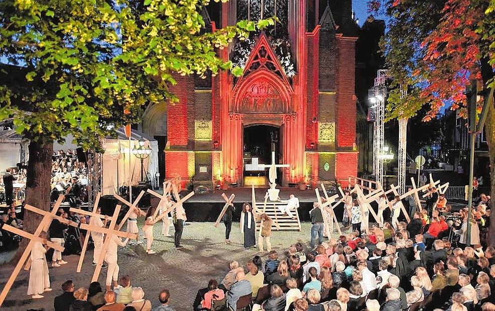 Kevelaer (DT) „Es war wunderbar, nur ein wenig lang“, bringt es die Dame, die das 80. Lebensjahr bereits einige Zeit hinter sich gelassen hat und nun mit ihrem Rollator am Samstagabend nach Hause strebt, in niederrheinischer Knappheit auf den Punkt. Mit dem Marienmysterium im Wallfahrtsort Kevelaer ist ein Musikexperiment gelungen, das man als einzigartig bezeichnen muss. Dreieinviertel Stunden dauert das in dreizehn Szenen gesetzte Wechselspiel aus großen Chorstücken, opernhaften Arien und filmreifen Massenszenen. Und schnell wird den mehr als 1 200 Zuschauern auf den extra aufgestellten Tribünen auf dem Kapellenplatz vor der Marienbasilika klar: Hier ist dem Komponisten Elmar Lehnen und dem Texter Bastian Rütten ein epochales Werk gelungen. Und mit ihrem minutenlangen Schlussbeifall zeigen sie, welchen Eindruck es bei ihnen hinterlassen hat.