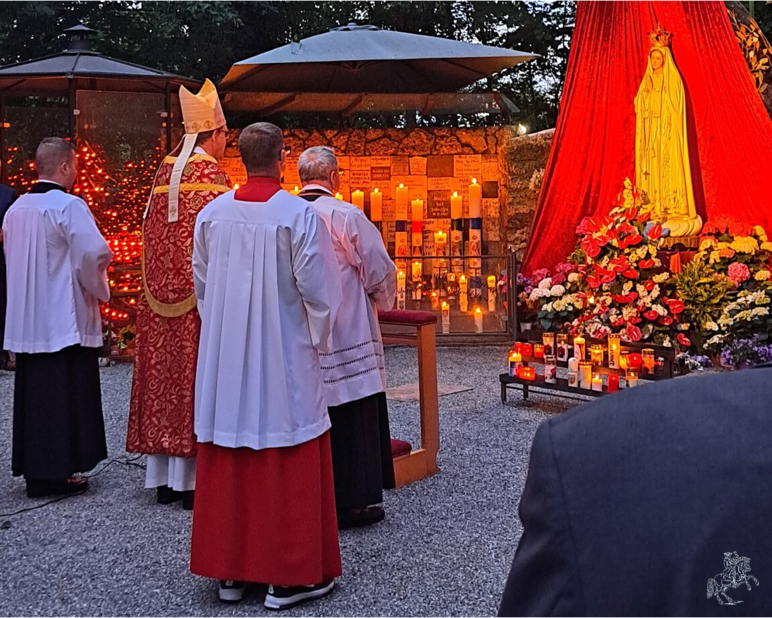 Nach den Fürbitten und dem feierlichen zelebriertem Hochgebet, strömten die Gläubigen sowohl innerhalb als auch außerhalb der Kirche zu den Kommunionbänken. Im Anschluss an das Pontifikalamt formierte sich die Prozessionsaufstellung mit der Herz-Mariä-Statue im Zentrum für die Prozession mit Gesang, Gebet und Litaneien durch den „Dom der Natur“. Hier wurde sichtbar, was die Gemeinde im Gottesdienst gesungen hatte: „Da schreitet Christus durch die Zeit, in seiner Kirche Pilgerkleid, Gott lobend, Halleluja.“ Im Zentrum dieses Domes, der Fatima-Grotte, sprachen die Gläubigen am Ende der Feier gemeinsam die Marienweihe. Nach dem Pontifikalsegen erklang die Papsthymne, womit der offizielle Teil des Abends ausklang. Die Gläubigen hingegen verharrten noch länger vor der Madonna, um „mit ihr eine Gebetsgemeinschaft zu bilden“.