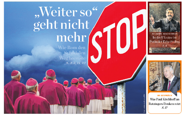 Die Diskussion um die Frage, ob Rom ein Stoppschild aufgestellt hat oder nicht, wurde durch die Veröffentlichung der Reden von Kardinal Ladaria und Kardinal Ouellet beendet. Der Synodale Weg kann so nicht weitergehen. Die Tagespost dokumentiert die Texte auch in der gedruckten Ausgabe. Dazu gibt es Stimmen von Bischöfen. Laienvertretern und aus dem Ausland. Es gibt weitaus mehr Themen als die unendliche Geschichte des Synodalen Weges. Ein Bericht über den Holodomor, ein Interview mit Paul Kirchhof, die Frage der Wahrheit und vieles mehr.