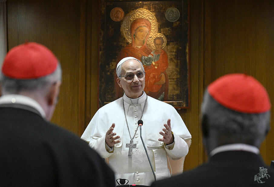 Brüder Kardinäle! Ich grüße euch und danke euch allen für diese Begegnung und für die Tage zuvor, die schmerzlich waren wegen des Verlusts des Heiligen Vaters Franziskus, herausfordernd wegen der Verantwortung, der wir uns gemeinsam gestellt haben, zugleich aber reich an Gnade und Trost im Heiligen Geist, gemäß der Verheißung, die Jesus selbst uns gegeben hat (vgl. Joh 14,25-27).