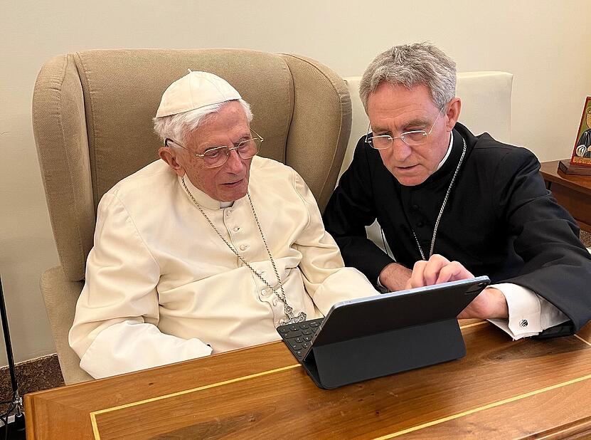 Es folgten Grußworte der Erzbischöfe Nikolai Eterović und Georg Gänswein. Erzbischof Eterović betonte, es sei stets das Anliegen des emeritierten Papstes, den Menschen zu den Quellen des Heils zu führen, die uns Jesus Christus erschlossen hat. Er erinnerte an seine lange Zusammenarbeit mit Papst Benedikt als Generalsekretär der Bischofssynode. Der Privatsekretär Erzbischof Georg Gänswein erinnerte daran, dass der Jubilar, der an einem Karsamstag geboren wurde, als erster Täufling mit dem neuen Osterwasser getauft wurde. Der 95. Geburtstag fand in diesem Jahr ebenfalls auf einen Karsamstag statt. Es sei, so der Erzbischof ein Hinweis auf das ganze Leben des Menschen, noch in Erwartung des wahren Osterfestes zu leben. Der Emeritus, betonte der Erzbischof, habe mit seiner Theologie die Kirche geleitet. Er stellte den engen Zusammenhang zwischen Katheder und Kathedra im Wirken des Emeritus dar.
