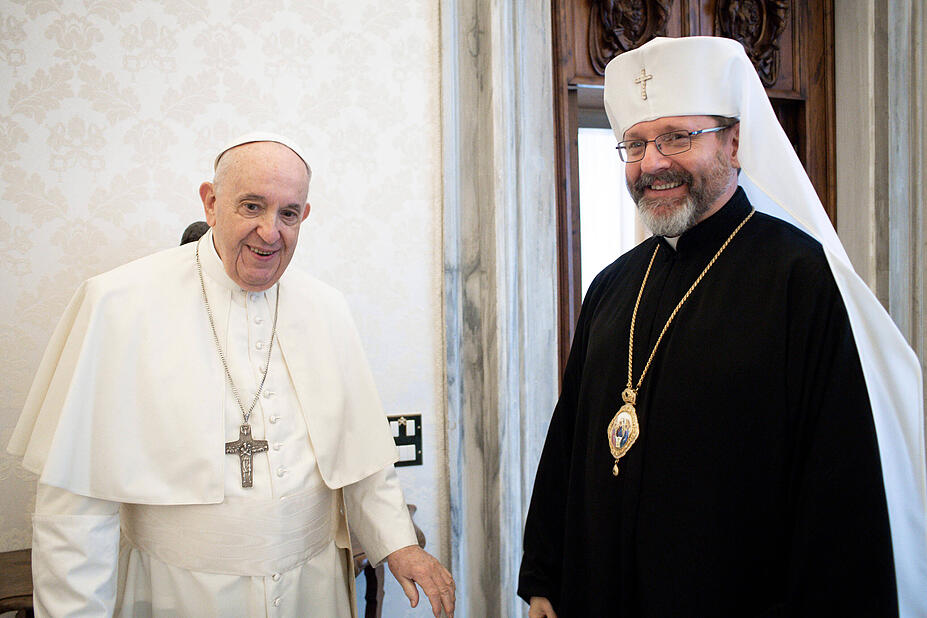 Zu einem Arbeitsbesuch hält sich das Oberhaupt der mit dem Papst unierten ukrainischen Katholiken des byzantinischen Ritus, Swjatoslaw Schewtschuk, derzeit im Vatikan auf. Am Montag berichtete der Großerzbischof von Kiew Papst Franziskus in der Bibliothek des Apostolischen Palastes über die aktuellen Leides seines Volkes und überreichte ihm ein Stück einer russischen Mine, die im März die Fassade der griechisch-katholischen Kathedrale von Irpin, einer Stadt nahe Kiew, beschädigt hatte. Die Kirche sei nahe bei den Menschen, soll Schewtschuk dem Papst gesagt haben. Jedes Gotteshaus, jedes Kloster und jedes weitere kirchliche Gebäude sei zu einem Zufluchtsort geworden.