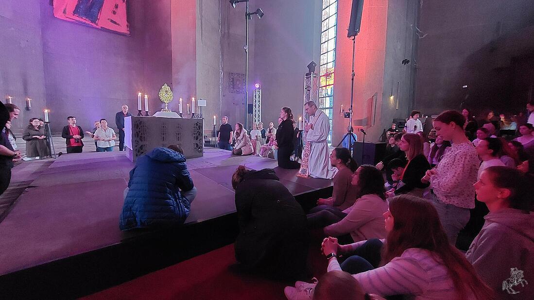 Der Einstieg war erst mal ein Kulturschock: Der Nevigeser Dom – ein riesiger Betonbau mit schroffen Kanten, kühl und düster. Und doch: Wer sich auf ihn einlässt, entdeckt das Geniale. Architekt Gottfried Böhm wollte mit seinem Bau einen Platz mitten im Alltag schaffen, ein Bild dafür, dass Kirche nicht abseits, sondern mittendrin ist. Schon am Freitagabend war spürbar: Hier passiert etwas Besonderes. Nach der Ankunft und einem ersten gemeinsamen Gebet erzählte Adrian Schilling, Berater und Familienvater, sehr ehrlich von seinem Glaubensweg. Danach: Lobpreis, der direkt ins Herz ging – kraftvoll, fröhlich, frei. Und mittendrin: Jesus im Allerheiligsten. Wer wollte, konnte beichten – viele taten es. Ein Team in der Küche sorgte liebevoll dafür, dass niemand hungrig blieb. Und am Ende des Tages: Kuchen, Tee, Gemeinschaft.