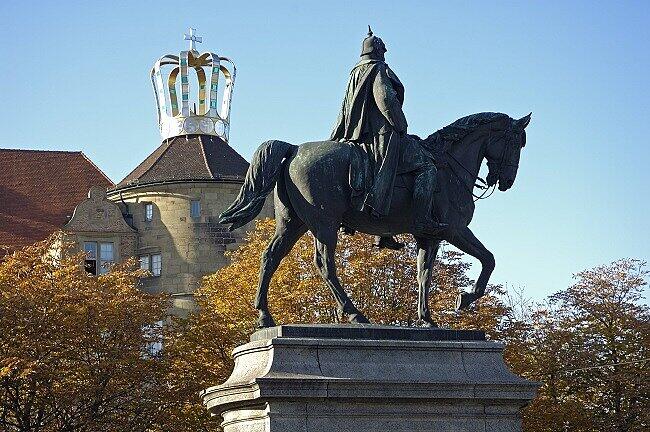 Das Reiterdenkmal von Kaiser Wilhelm I. ist eines von 400 Denkmälern, die zu Ehren dieses Kaisers in Deutschland errichtet worden sind. Mit dessen Enthüllung im Jahr 1898 — zehn Jahre nach dem Tod des Kaisers — wollte Württemberg seine Zugehörigkeit zum Kaiserreich bekunden. Das Denkmal ist mit Sockel rund acht Meter hoch und zeigt den Herrscher mit dem Blick aufs Schloss gerichtet. Früher stand an der Stelle ein Brunnen. Entworfen haben das Denkmal die Münchener Professoren Wilhelm von Rümann und Friedrich Ritter von Thiersch. DT/dsc