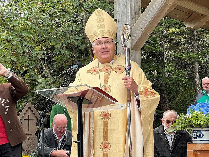 Im Mittelpunkt der Predigt von Bischof Voderholzer stand ein Spruch aus einem Alpen-Gipfelbuch, der ihn seit Jahren begleitet: „Willst du Gottes Allmacht sehen, musst du in die Berge gehen. Willst du Gottes Liebe sehen, bleib unter diesem Kreuze stehen.“ Dieser Vers bildete die Klammer der Predigt. „Dieser Satz“, so der Regensburger Oberhirte, beschreibt, „was wir heute gemeinsam erleben.“ Wir dürfen Gottes Allmacht in der Schönheit der Natur bestaunen und seine Liebe im Zeichen des Kreuzes erfahren.