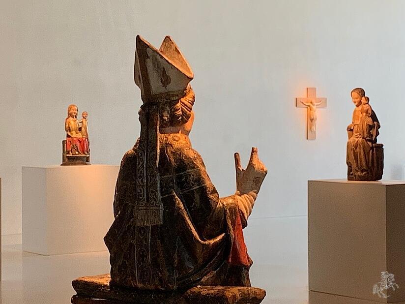 Was für eine bewegende Szenerie, was für eine illustre Gesellschaft, die die Besucher im größten Ausstellungsraum empfangen: Sieben mittelalterliche Darstellungen der Muttergottes mit Kind sowie zwei Darstellungen von Heiligen stehen auf Sockeln. Sie sind raumgreifend elliptisch aufgestellt und scheinen miteinander in einem intensiven Dialog vertieft. Worum geht es wohl? Möglicherweise um die Frage nach dem Schicksal des Kindes? Oder um das gleichzeitige Gott- und Menschsein Jesu Christi? An einer der Wände hängt ein elfenbeinernes Kruzifix aus dem zwölften Jahrhundert, das geradezu zu schweben scheint und sich unaufdringlich in den Dialog der Figurengruppe einfügt. Oder geht es doch um „Adam und Eva“, deren Vertreibung aus dem Paradies von Adalbert Trillhaase (1858-1936) in höchst eigenwilliger Darstellung in ein Ölbild gebannt wurde und nun ebenfalls mit den hölzernen Skulpturen korrespondiert?