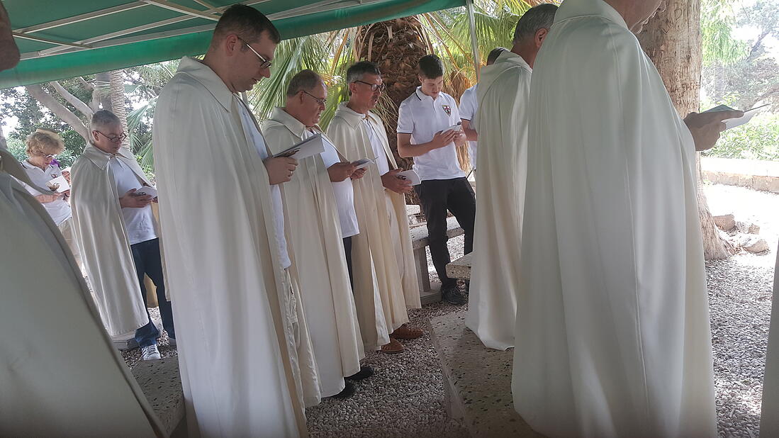 Der erste Tag der Pilgerreise des Tempelritterordens beginnt am Pfingstsonntag für die 28 Teilnehmer mit einer Heiligen Messe morgens auf dem Berg der Seligpreisungen. Hier hat Jesus von Nazareth einst seine wunderbare Bergpredigt gehalten, hier wählte er die Apostel aus. Hier veränderte er den Lauf der Weltgeschichte.