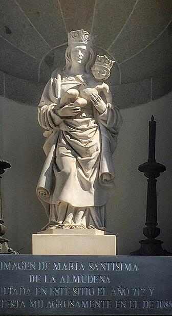 Der erste Teil der Inschrift – das Verstecken des Bildes im Jahre 712 – lässt sich historisch kaum nachweisen. Im Museum „San Isidro – Die Ursprünge Madrids“ klafft beispielsweise eine jahrhundertelange Kluft zwischen dem Abschnitt „Römer und Barbaren“ mit einigen wenigen westgotischen Funden und der eigentlichen Gründung Mayrits Mitte des 9. Jahrhunderts. Es gibt keine geschichtlichen Zeugnisse für eine christliche Siedlung vor 711, als die Mauren die Iberische Halbinsel eroberten und das Westgotenreich zerschlugen. In der Fachwelt herrscht zwar übereinstimmend die Meinung, dass die erste Mauer in Madrid von Emir Mohamed I. um das Jahr 865 gebaut wurde. Dass Christen vor der maurischen Invasion hier lebten, kann jedoch nicht ausgeschlossen werden. Aber ganz gleich ob das Bild der Gottesmutter „von der Almudena“ bereits 712 existierte oder erst 1085 geschaffen wurde – es kann als „Grundstein“ des christlichen Madrid bezeichnet werden.