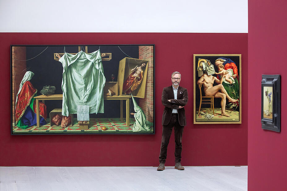 Doch auch an Malern des 16. Jahrhunderts nimmt Michael Triegel Maß: Agnolo Bronzinos "Bildnis eines jungen Mannes mit Laute", 1532 entstanden, spiegelt Triegel in seinem Gemälde "Selbst in Schwarz". Wo er Bronzinos Laute gegen einen Kompass austauscht, den sein "Selbst" in der Hand hält. So als wolle er zeigen: Ich weiß genau, wohin meine Fahrt geht.