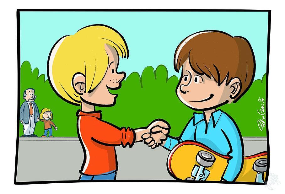 Plötzlich blieb Jonas stehen. Ein Junge kam ihnen auf dem Skateboard entgegen. Jonas stemmte seine Hände in die Hüften: „Ich glaub’s ja nicht: Das ist doch der Oskar! Wenn man vom Teufel spricht …“ – „Na, na!“, sagte Opa: „Jetzt schnauf erst mal durch und dann zeig, dass du zu Jesus gehörst!“ Jonas stutzte: „Ach so. Dann … hmm … Du meinst, ich soll ihm vergeben?“ Opa zog die Augenbrauen hoch: „Du kannst ja erst mal mit ihm reden, Jonas!“ – „Und du bleibst da stehen, Opa?“ Der lächelte: „Und wir schauen zu, wie du Frieden machst.“