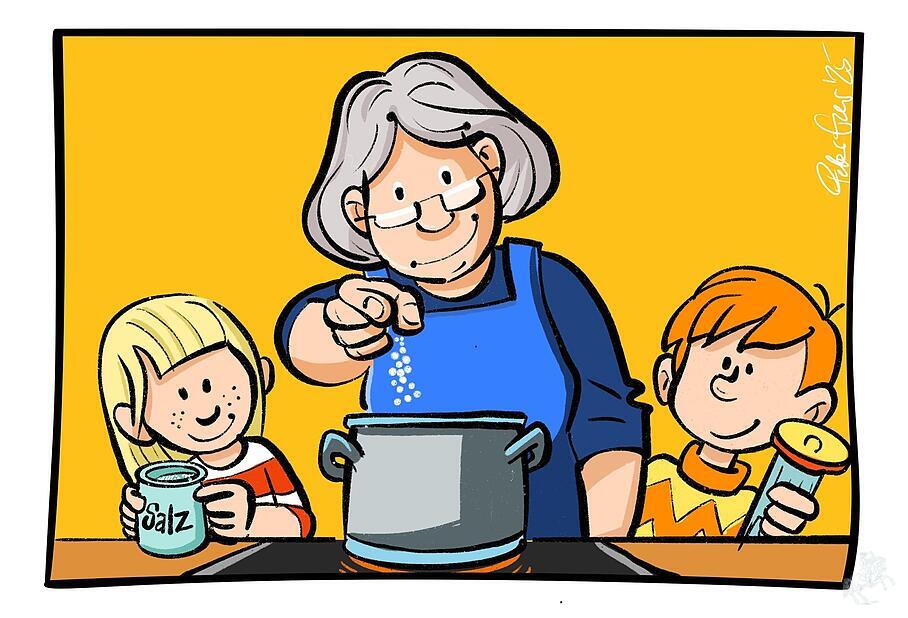 Opa lächelt. „Das ist eine gute Frage. Allein könnten wir das nicht. Aber Jesus hat uns zuerst geliebt. Er ist selbst das wahre Salz – er hat den Menschen gezeigt, wie Liebe, Barmherzigkeit und Wahrheit schmecken.“ Opa liest weiter: „Wenn das Salz seinen Geschmack verliert, womit kann man es wieder salzig machen?“ „Dann ist es nutzlos“, sagt Jonas. „Richtig“, erklärt Opa. „Jesus meint: Wenn wir vergessen, wie er gelebt hat, und nur an uns selbst denken, dann verlieren wir unseren Geschmack. Aber wenn wir bei Jesus bleiben, schenkt er uns seine Kraft – das nennt man Gnade. Sie hilft uns, Gutes zu tun.“