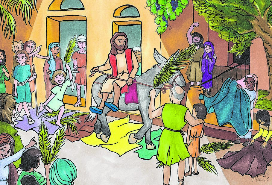 Als sich Raffi mit dem fremden Mann schon dem Abhang des Ölbergs näherte, begannen die Menschen um Levi herum freudig und mit lauter Stimme zu rufen und Gott zu loben. Ja, Levi hatte sich nicht verhört, die Menschen lobten Gott und riefen laut „Hosanna“. Einige kamen dem Mann auf dem Esel aus der Stadt mit Palmzweigen entgegen und riefen ebenfalls „Hosanna, gepriesen sei unser König!“ Levi war sofort angesteckt: Er lief zu einem Baum, riss einen Zweig ab, rannte schnell wieder zurück zu dem Leuten, zu Raffi und zu dem fremden Mann, der auf ihm ritt und rief aus Leibeskräften „Hosanna, gepriesen sei unser König!“