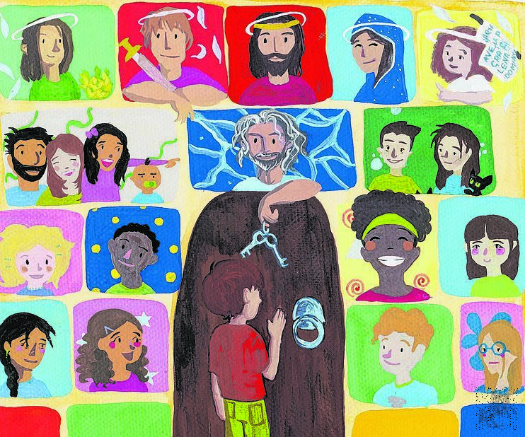 Paulus erklärt uns in diesem Bild, dass Jesus das Haupt ist und wir der Leib. Zu diesem Leib gehören nicht nur wir Lebenden, sondern auch die Christen, die vor uns gelebt haben und alle, die noch nach uns gerufen werden. Es ist die Gemeinschaft der Heiligen, weil wir wissen, dass schon viele Heilige im Himmel bei Gott sind und dass auch wir zur Heiligkeit berufen sind. Und weil Jesus bereits in den Himmel zum Vater gegangen ist, gibt es auch eine himmlische Kirche, die mit uns verbunden ist. Wenn wir auf der Erde die heilige Messe feiern, so feiern auch die Engel im Himmel die heilige Messe. In der Messe spricht der Priester: „Und so singen wir gemeinsam mit den himmlischen Chören: „Heilig, heilig, heilig...“ Stell dir vor, oben feiern die Engel gemeinsam mit uns hier unten den Gottesdienst! In der Messe, den Sakramenten und im gemeinsamen Gebet bleiben wir mit Jesus verbunden. Es ist wirklich so, wie er versprochen hatte: „Wenn zwei oder drei in meinem Namen versammelt sind, bin ich mitten unter ihnen.“ Kirche ist Volk Gottes.