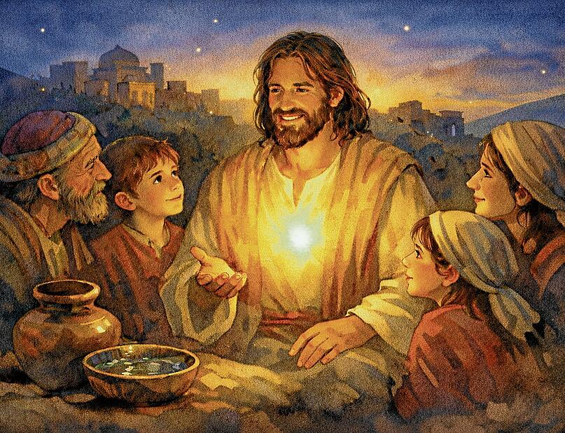 Zur Zeit Jesu gab es während des Laubhüttenfestes zwei besonders schöne Rituale in Verbindung mit dem Tempel: Jeden Tag wurde Wasser geschöpft und mit Wein auf den Altar ausgegossen. Es war ein Zeichen dafür, dass Gott Leben und Freude schenkt. Und am letzten Tag des Festes wurde der Tempel, der auf einem Hügel stand, festlich beleuchtet, sodass die ganze Stadt davon beleuchtet wurde. Das sollte ein Zeichen dafür sein, dass Gottes Gegenwart den Tempel erfüllte.