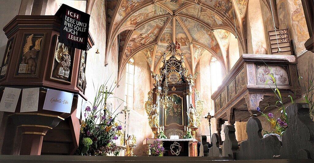 Die Holzemporen, der Altarraum, die Abschlüsse der Bänke – alles ist fein und umfassend bemalt. Das macht die Kirche zu einem sakralen Schatz mit Seltenheitswert. Ihre Geschichte ist lang und wechselhaft. Einst war sie den Heiligen Georg und Mauritius geweiht.