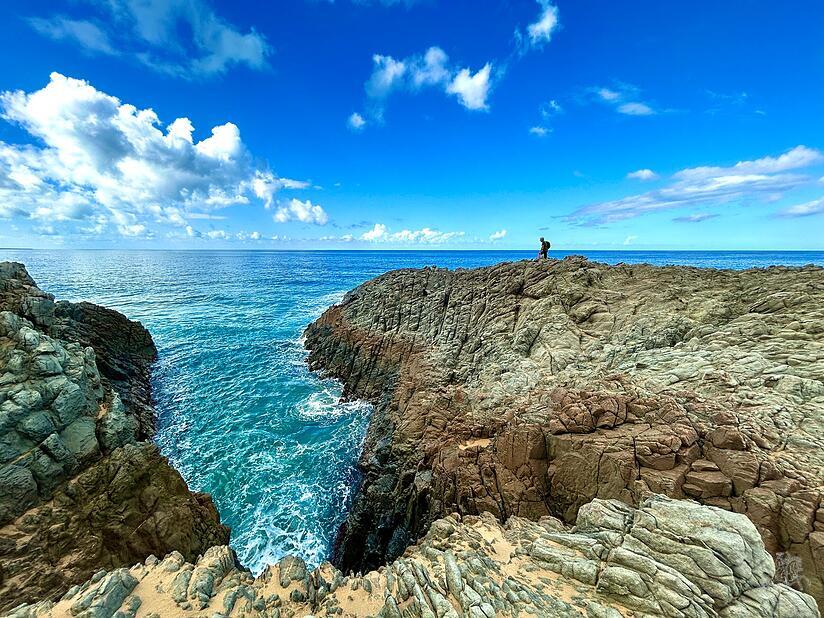 Hinter der Kapelle folgt der Weg in Richtung Westen. Basaltwände rücken näher, Geröllfelder wechseln mit grünen Inseln aus Schilf und Palmen. Kaum ein anderer Ort zeigt so eindrucksvoll, wie Wasser, Wind und Zeit die vulkanische Landschaft geformt haben. Schließlich öffnet sich die Schlucht zur Küste bei Ajuy. Über den Klippen erhebt sich dort eines der spektakulärsten Naturdenkmäler Fuerteventuras: die Peña Horadada, ein rund zwanzig Meter hoher Felsbogen, geformt aus Millionen Jahren Brandung, Salz und Erosion.