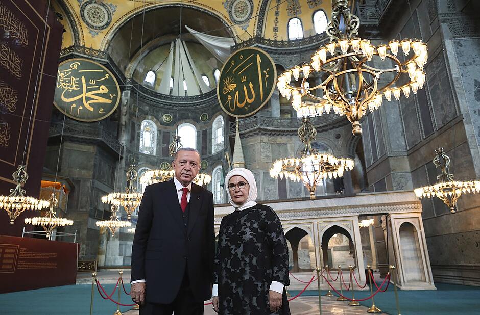 Staatspräsident Recep Tayyip Erdogan persönlich eröffnete – trotz Protesten aus aller Welt – zu Mittag das muslimische Freitagsgebet in der Hagia Sophia. Mit einer mehrstündigen Koran-Rezitation und dem Freitagsgebet wurde die einstige Basilika, die seit 86 Jahren als Museum galt, wieder zur Moschee gemacht. Weil aufgrund der strengen Corona-Vorschriften nur etwa tausend Muslime dazu in die Hagia Sophia eingelassen wurden, beteten Abertausende auf den Vorplätzen der Hagia Sophia.