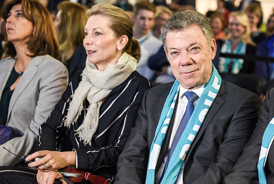 In seinem Eingangsstatement beschrieb Santos seinen Weg „vom Kriegsminister zum Friedenspräsidenten“ und erläutert die Besonderheiten des Friedensabkommens. Der Aufbau des Friedens, so Santos, sei wie der Bau einer Kathedrale – langwierig und im Herzen beginnend. Es gehe beim Frieden in Kolumbien weniger um die strafende Gerechtigkeit mit Blick in die Vergangenheit, sondern vielmehr darum, eine Gerechtigkeit durch Perspektiven für die Zukunft zu schaffen: Gerechtigkeit des Übergangs nennt Santos das – „justicia transicional“. Das schließe die Reintegration der FARC-Kämpfer in die Gesellschaft ebenso ein wie die Berücksichtigung der Opferrechte, insbesondere das Recht auf Wiedergutmachung und der Schutz davor, dass sich wiederholt, was geschehen ist. Das sei schwierig und – vor allem was die teilweise Amnestie der Kriegsverbrecher angeht – von vielen Menschen nicht verstanden worden. Wie kann man den ehemaligen Guerilleros politische Mitbestimmung einräumen und sie mit an der Zukunft des Landes bauen lassen, wenn sie vergewaltigt und gemordet haben – in zigtausenden Fällen?